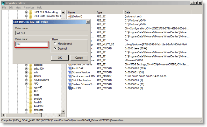 After this vCenter system was fixed, we checked all of the other vCenter servers onsite and found that their vCenter 4.1 server they were using for non-production also had the same error. That vCenter server was running on a Windows 2003 server and we did have to stop and restart the AD Web Services service to load the corrected SSL port value and resolve the error.