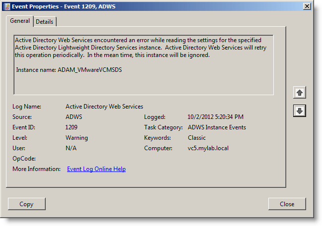 Recently I was onsite with a customer helping them deploy a new vSphere 5.1 environment to host a new Exchange 2010 system. As part of the deployment, we setup Alan Renouf’s vCheck 6 script and started working through the process of setting it up to run as a scheduled task. As we were manually running the task we noticed that the output showed errors every minute for the AD Web Services and AD Lightweight Directory Services (ADAM).