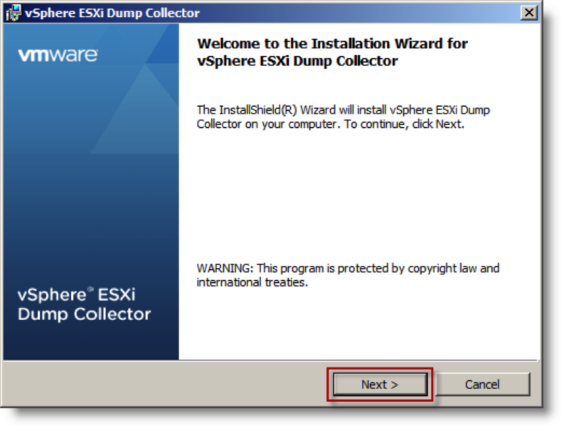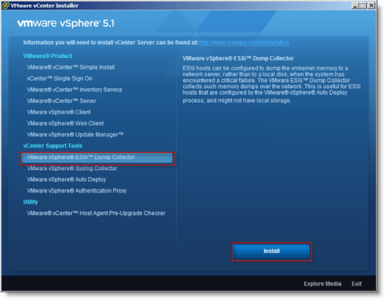 From the VMware vCenter Installer, select “VMware vSphere ESXi Dump Collector”. Then click “Install” to begin the installation.