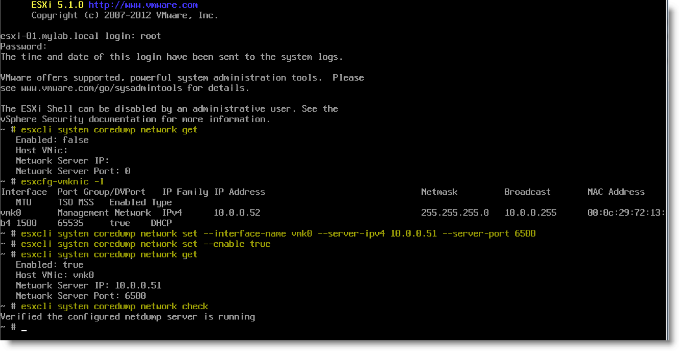 ~ # esxcli system coredump network set –interface-name vmk0 –server-ipv4 10.0.0.51 –server-port 6500