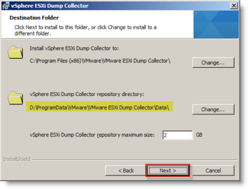On the Destination Folder page, click the “Change…” button beside “vSphere ESXi Dump Collector repository directory:”
