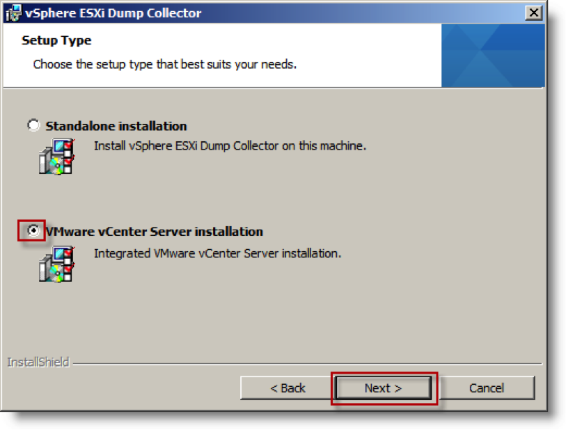 On the Setup Type page, select “VMware vCenter Server installation”, then click “Next >.”