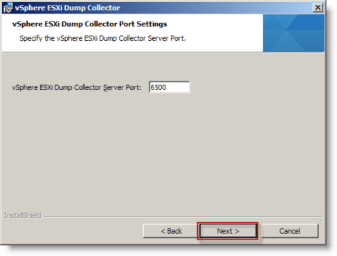 On the vSphere ESXi Dump Collector Port Settings page, click “Next >” to accept the default value of UDP port 6500.