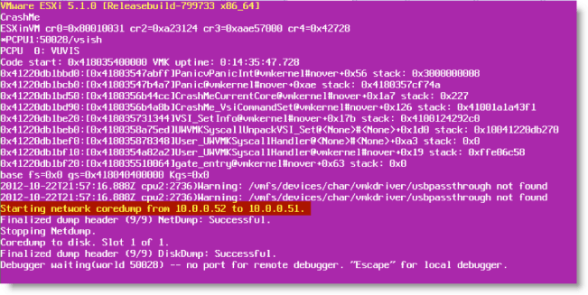 Using the vsish tool and specific setting that Eric Sloof or NTPRO.NL described in his post “Lets create some Kernel Panic using vsish“, I crashed the ESXi host. As you can see in the screenshots, I was rewarded with a purple screen and success with transmitting the dump over the network to my vCenter server!