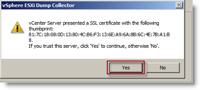 If you are using the default self-signed SSL certificate for vCenter, you will receive a message with the SHA1 thumbprint value for the vCenter server’s certificate.  Click “Yes” to trust that the certificate for connecting to the vCenter server.