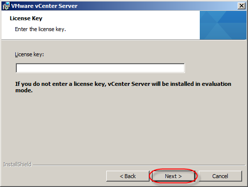 In the license key screen, enter your license key and then click Next. (If you have a valid vCenter 5.x license and are performing an upgrade, your existing key will work when the install is completed.)
