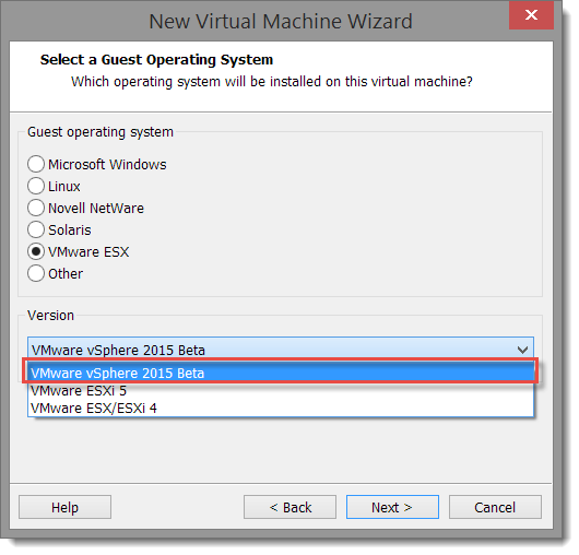 Click Next >. Notice that The OS was detected! If we chose I will install the operating system later, the next page in the wizard select ESX Server and VMware vSphere 2015 Beta for the version.