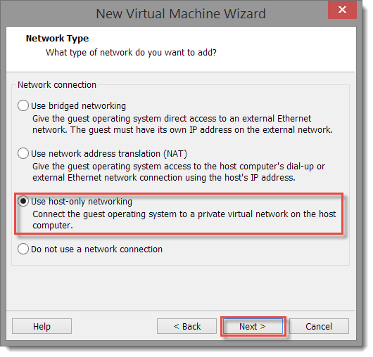 On the Network Type page, I selected Use host only networking so that the VM would get an IP address with existing management VM DHCP server and use the private DNS and AD that are already configured on a private vmnet.