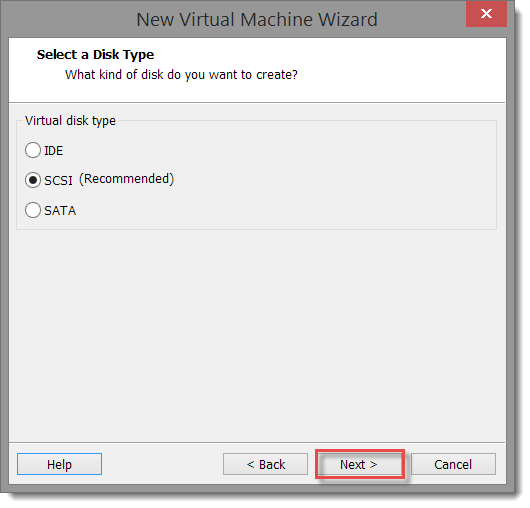 On the Select a Disk Type page, accept the default disk type of SCSI.