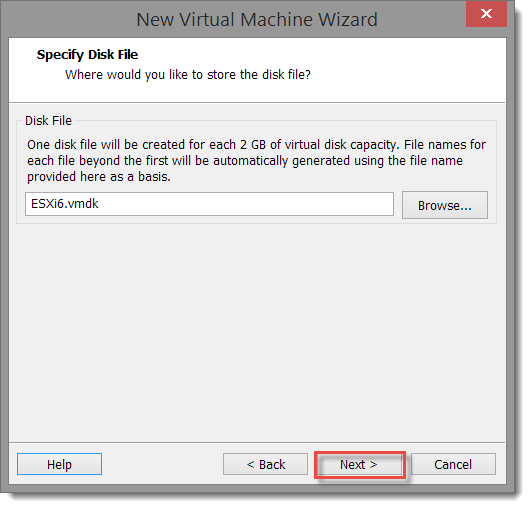 On the Specify Disk File page, accept the suggested file name (<VM display name>.vmdk).