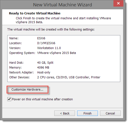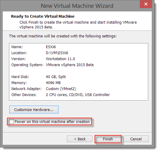 On the Ready to Create Virtual Machine page, I select Customize Hardware… so I can configure the VM’s NIC connection for the specific private vmnet I use for accessing management VMs and infrastructure services.