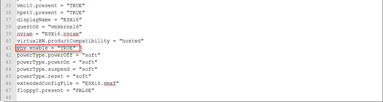 Browse to the location of the ESXi6.vmx file and open it for editing. (VMware KB 1714- Tips for editing a .vmx file)